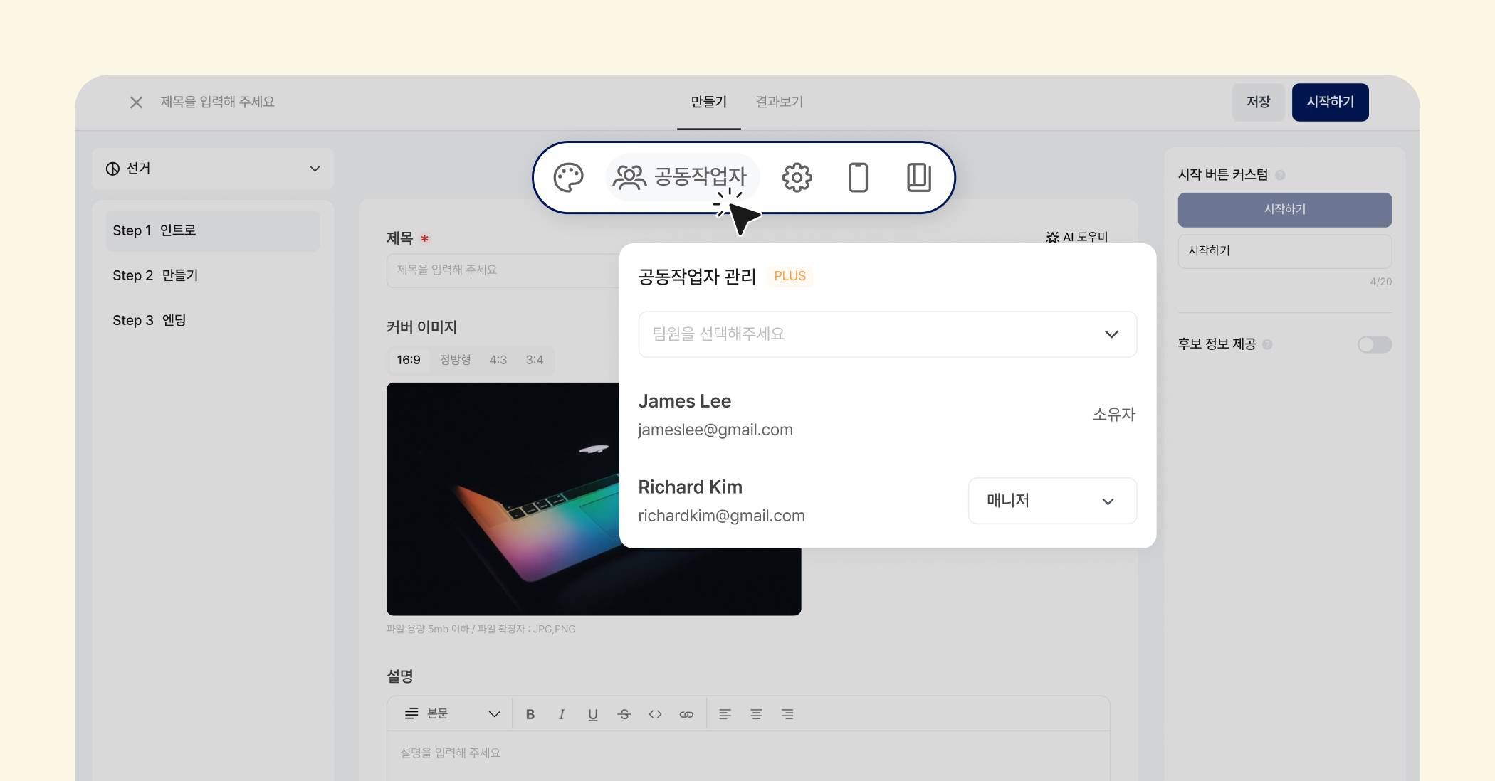 공동작업자를 등록하려면 먼저 그 사람이 채널 매니저로 초대되어야 해요. 매니저 권한과 초대 비용은 여기를 클릭하면 확인할 수 있어요.