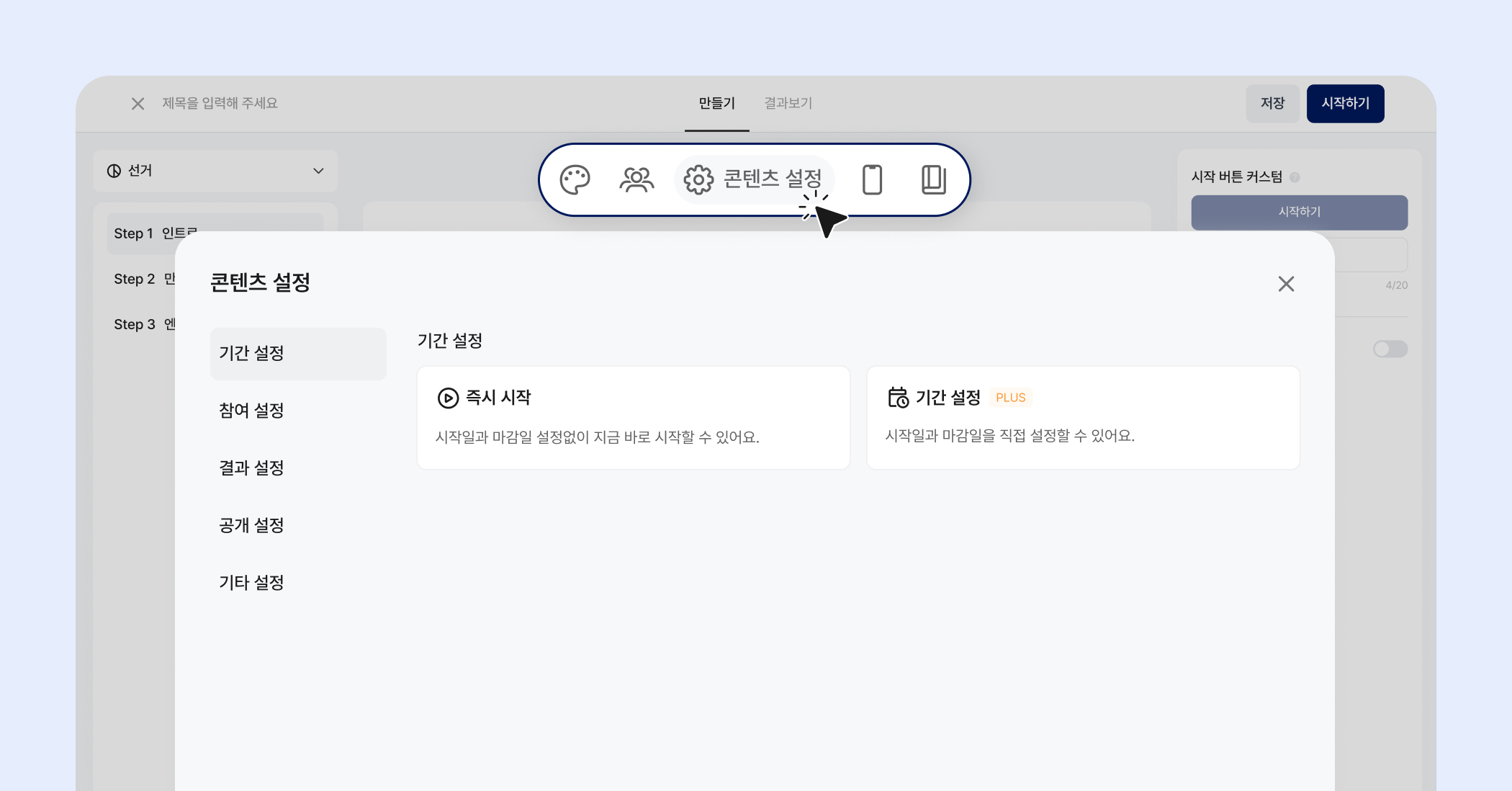 상단 메뉴바에 있는 "콘텐츠 설정"을 눌러 콘텐츠의 세부 설정을 할 수 있어요.