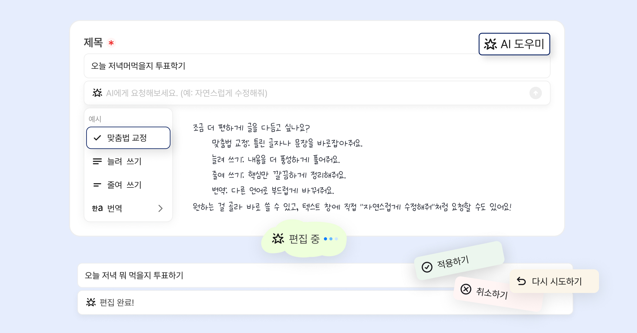 지금 입력한 내용을 바탕으로, 더 쉽고 매끄럽게 콘텐츠를 다듬을 수 있어요.