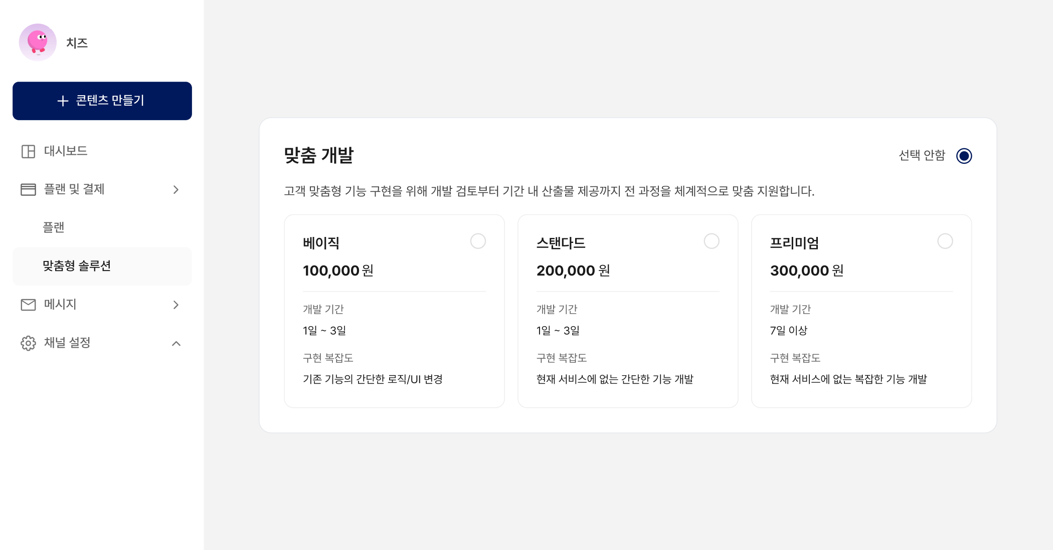 프리미엄 | 300,000원 | 7일 이상 | 현재 서비스에 없는 복잡한 기능 개발 |