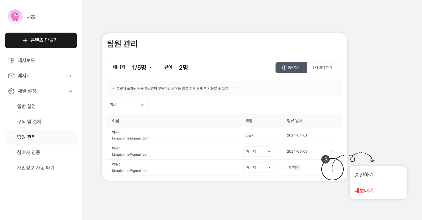 팀원이 링크를 통해 합류 요청을 한 이후, 팀원 관리에서 팀원 목록을 볼 수 있어요. 합류대기중인 팀원의 [➌ 더보기] 아이콘을 클릭한 후 승인하기를 확인해주면 합류에 성공해요!