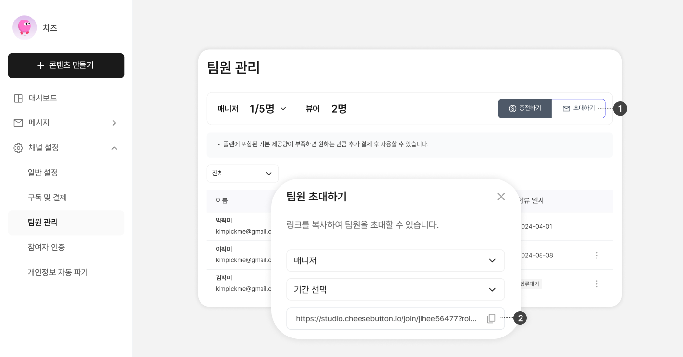 팀원을 초대하기 위한 비용을 충전하고, 팀원를 초대할 수 있어요.