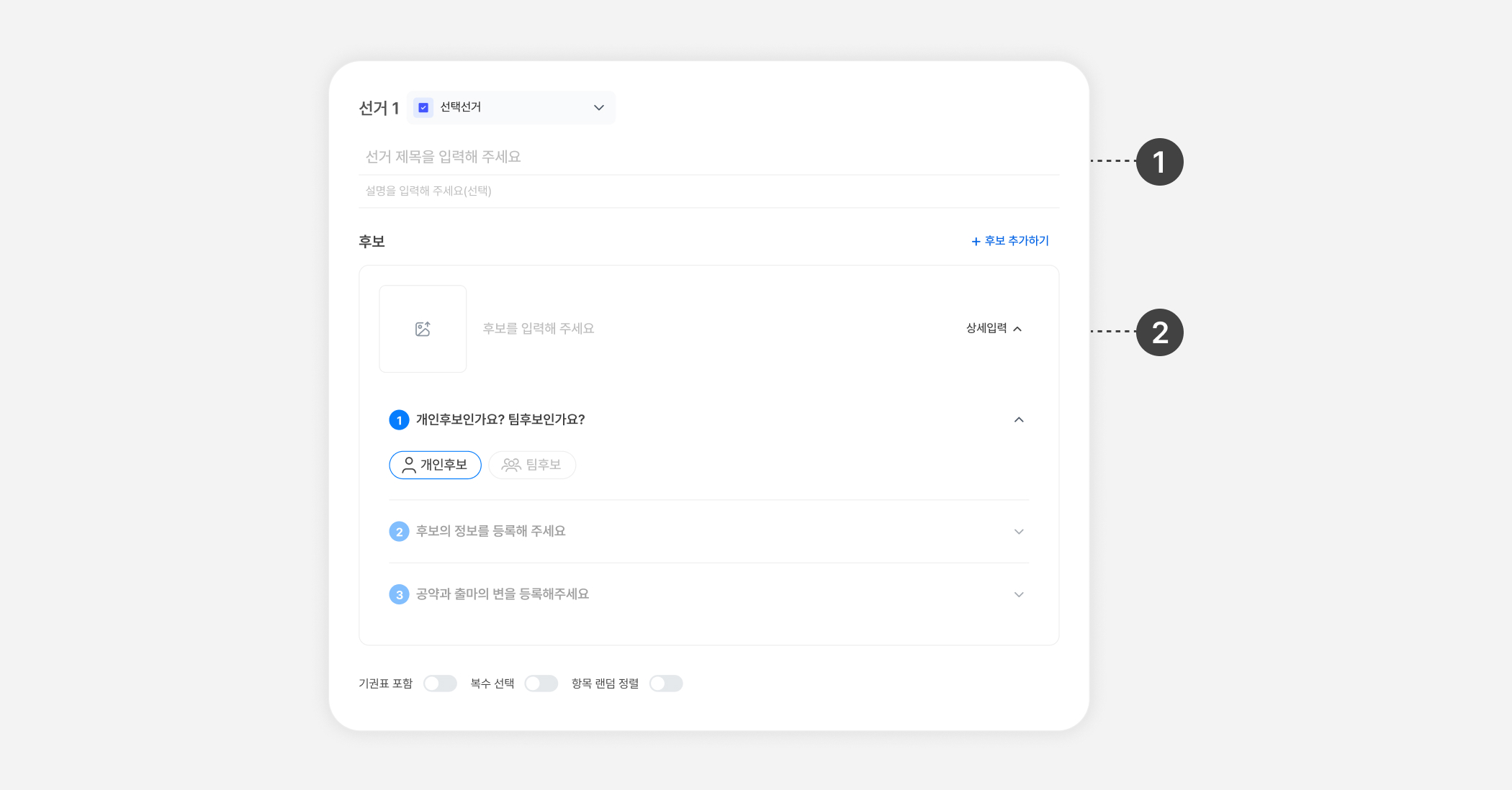 ➊ 개인후보 / 팀후보 설정 : 개인 단위로 출마했다면 [개인후보]를, 팀 단위로 출마했다면 [팀후보]를 선택해보세요.