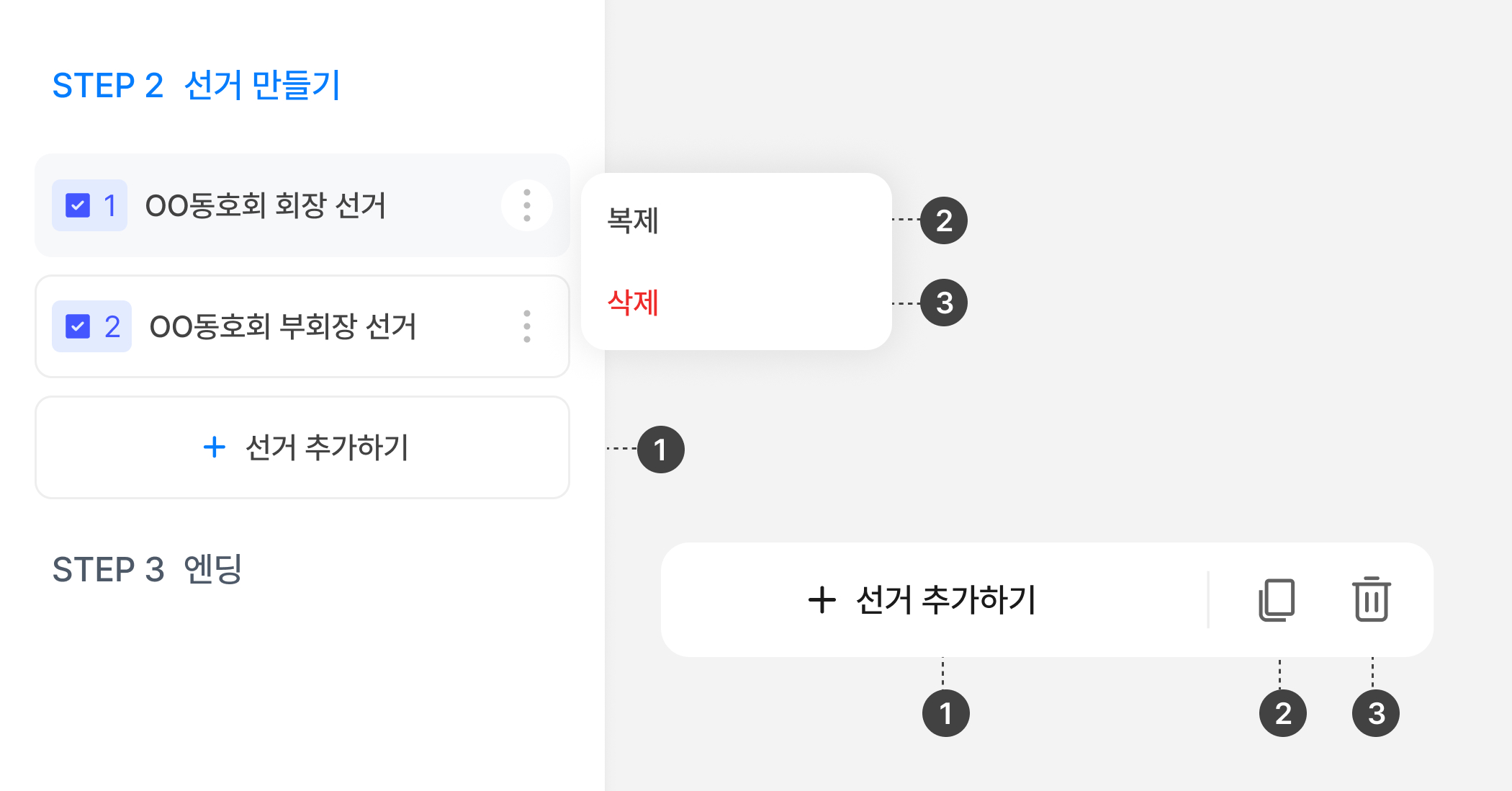 [STEP 2 선거 만들기]에서 선거 유형을 선택하면 본격적인 선거 만들기 화면이 펼쳐져요. 화면의 구성 요소는 다음과 같아요.