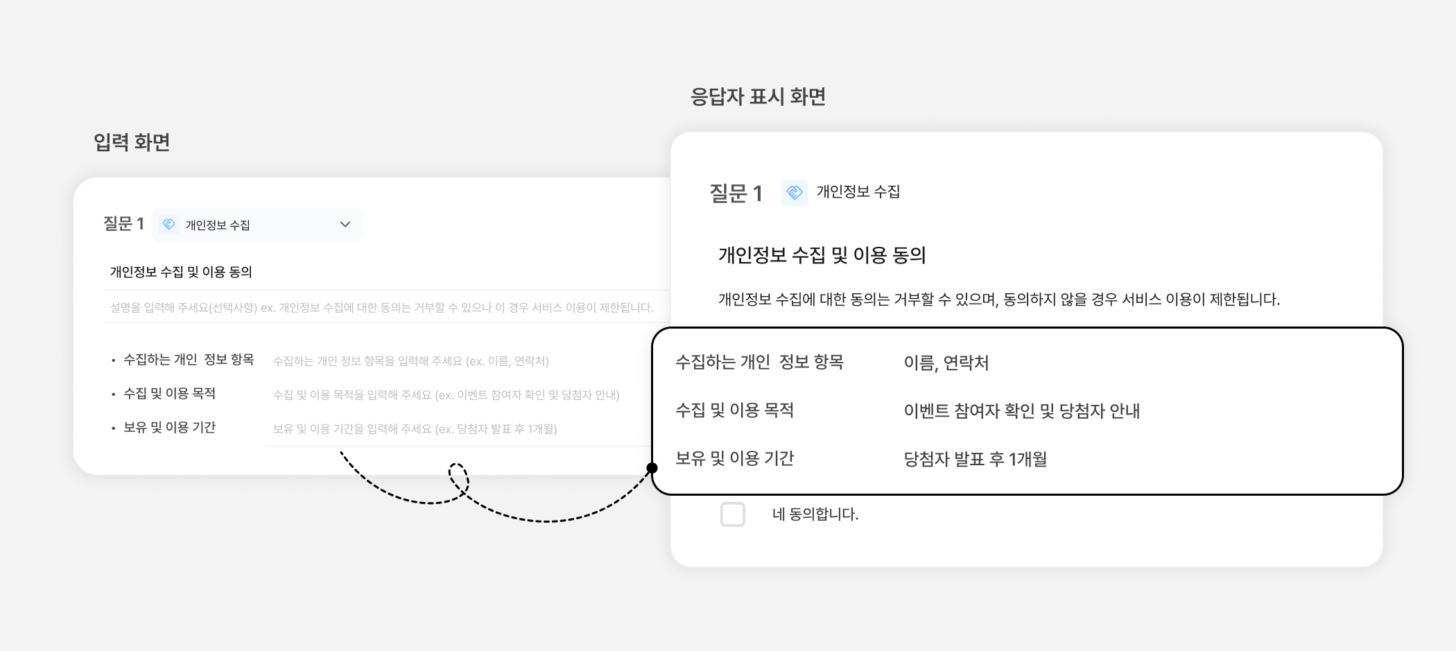 수집하는 개인정보 항목, 수집 및 이용 목적, 보유 및 이용 기간을 입력할 수 있는 질문 유형이에요.