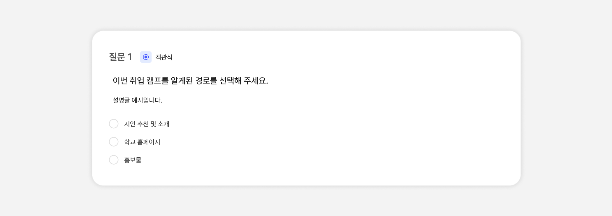 객관식 보기를 제공하고 답을 받는 질문 유형이에요. 관리자가 [복수선택] 옵션을 활성화하면 참여자는 여러개의 보기를 선택할 수 있어요.