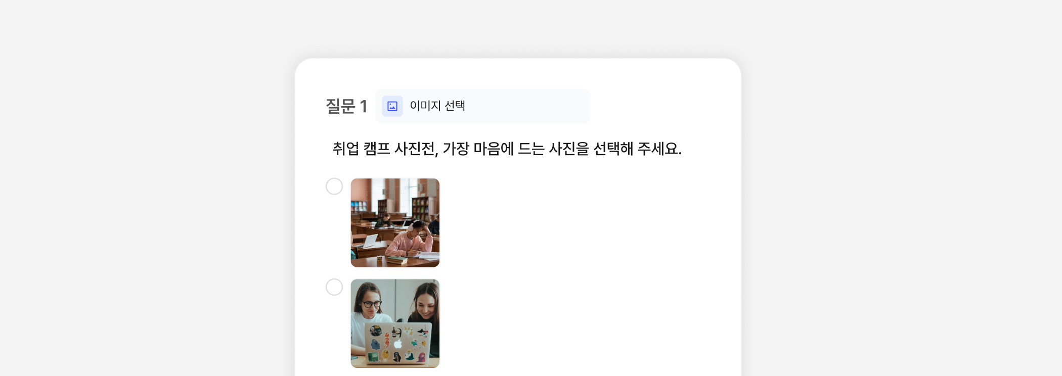 객관식 문항에 이미지를 첨부하고 싶다면 [이미지선택] 유형을 사용해보세요. 이미지에 대한 설명은 필요한 경우에만 입력해도 괜찮아요.