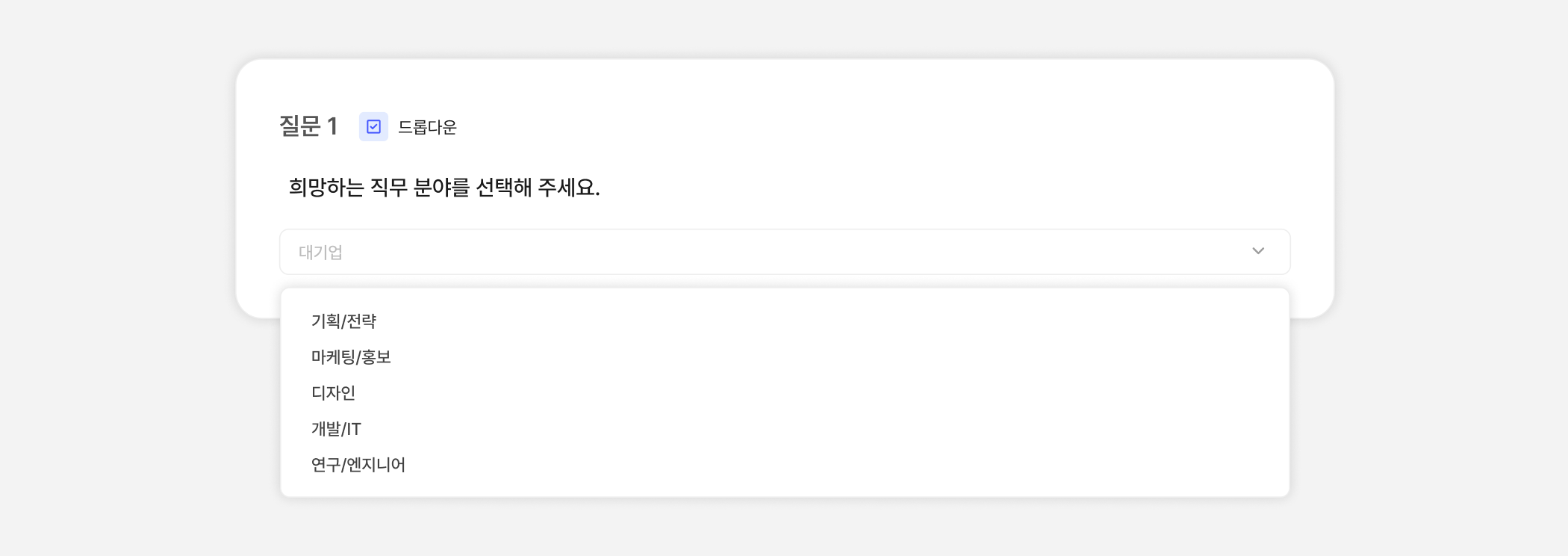 관리자가 입력한 항목이 드롭다운 형태로 보여지는 질문 유형이에요. 참여자들은 드롭다운 항목 중 하나를 답변으로 제출할 수 있어요.