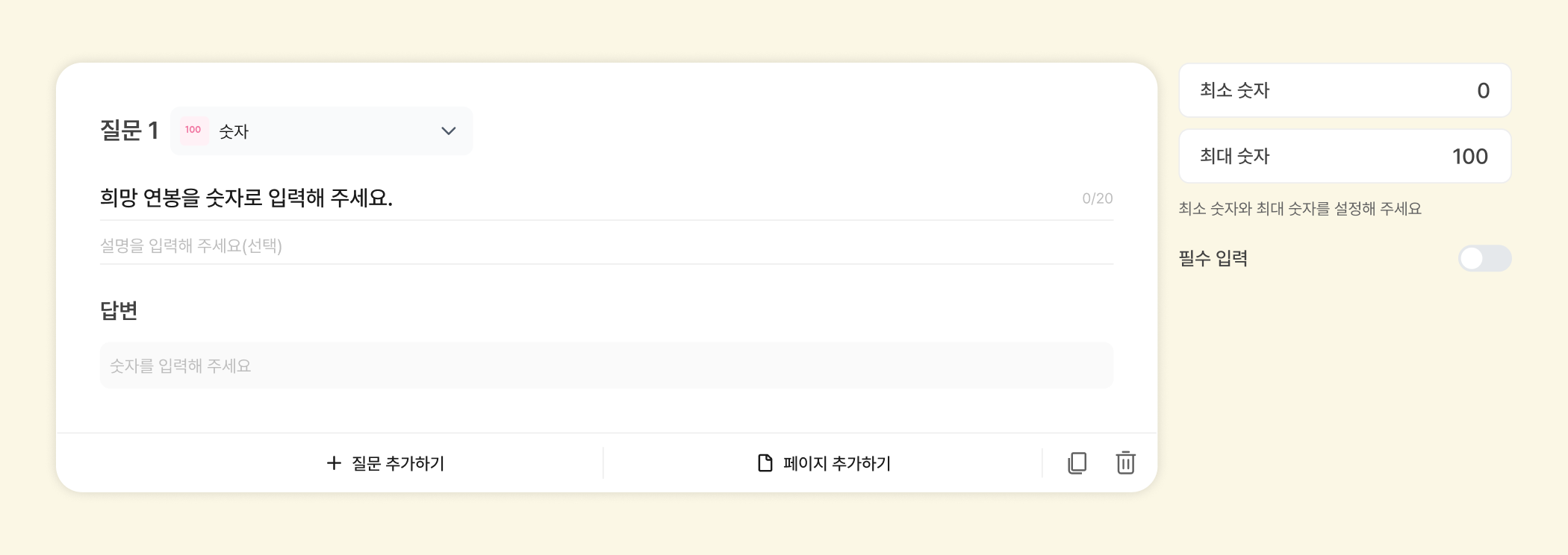 각 문항에 대해 숫자를 입력할 수 있는 질문 유형이에요. 관리자는 참여자가 입력할 수 있는 최소, 최대 숫자를 입력할 수 있어요.