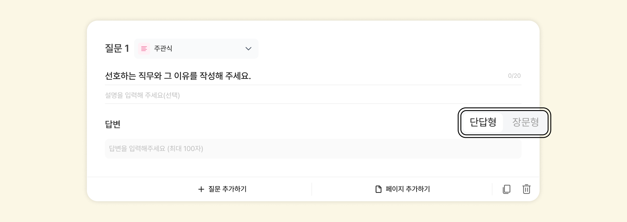 참여자가 직접 작성한 문장을 응답받을 수 있는 질문 유형이에요. 100자 이하의 짧은 답을 유도하고 싶다면 [단답형 문항]을, 2,000자 이하의 상세한 답변을 얻고 싶다면 [장문형 문항]을 선택하세요.