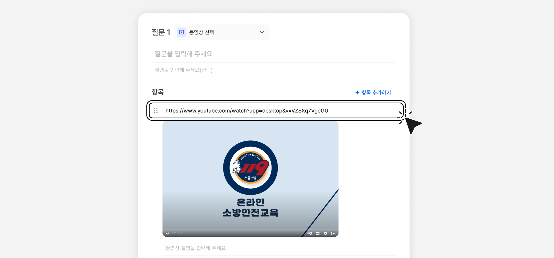 객관식 문항에 동영상을 첨부하고 싶다면 [동영상선택] 유형을 사용해보세요. 동영상 URL을 항목에 입력하면 참여자들이 응답 화면에서 바로 동영상을 재생할 수 있어요.