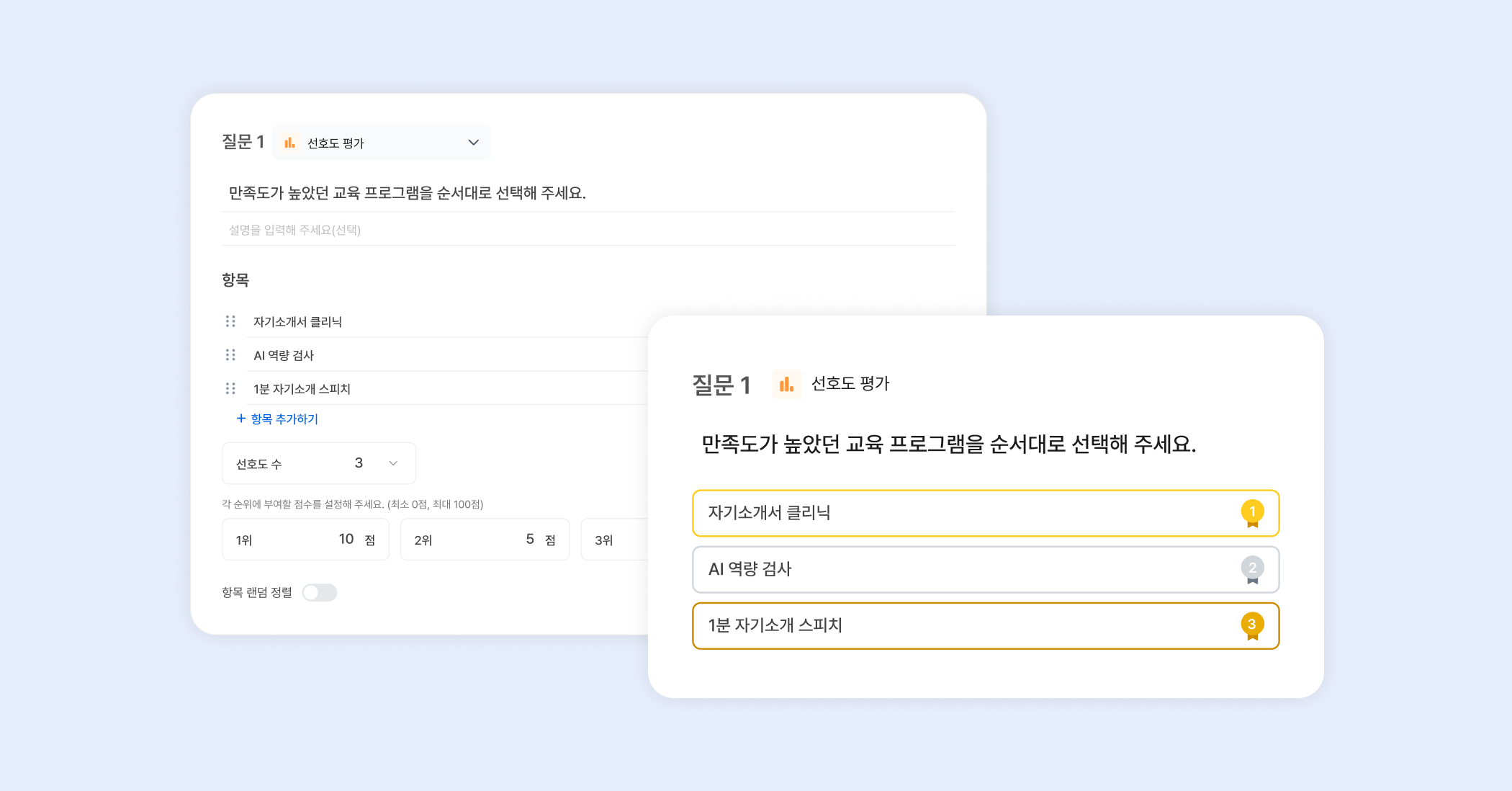 [선호도평가] 유형은 질문에 따라 항목별 순위를 채점해 응답하는 질문 유형이에요. 관리자는 각 순위에 부여할 점수를 할당할 수 있어요(예 : 1위 5점, 2위 3점, 3위 1점). 모든 참여자가 선호도 평가를 완료했을 때 점수의 합이 높은 항목이 더 높은 순위를 가져요.