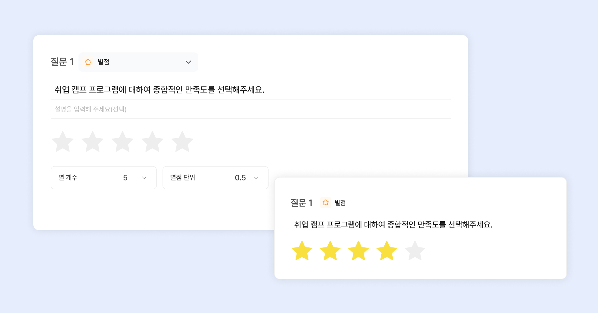 질문에 대한 별점을 평가받을 수 있는 질문 유형이에요. 관리자는 참여자가 입력할 수 있는 별 개수(1~10)와 별점 단위(0.5 혹은 1)를 설정할 수 있어요.