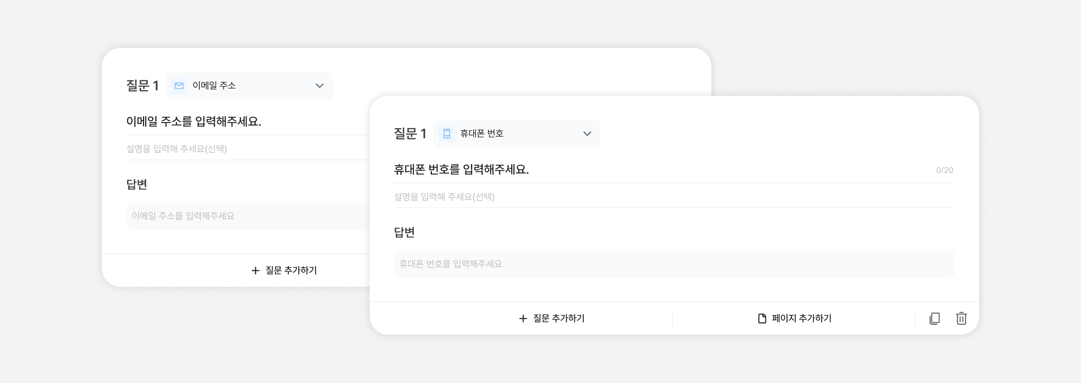 참여자의 휴대폰번호를 입력할 수 있는 질문 유형이에요. 하이폰 없이 숫자만 입력할 수 있어요.