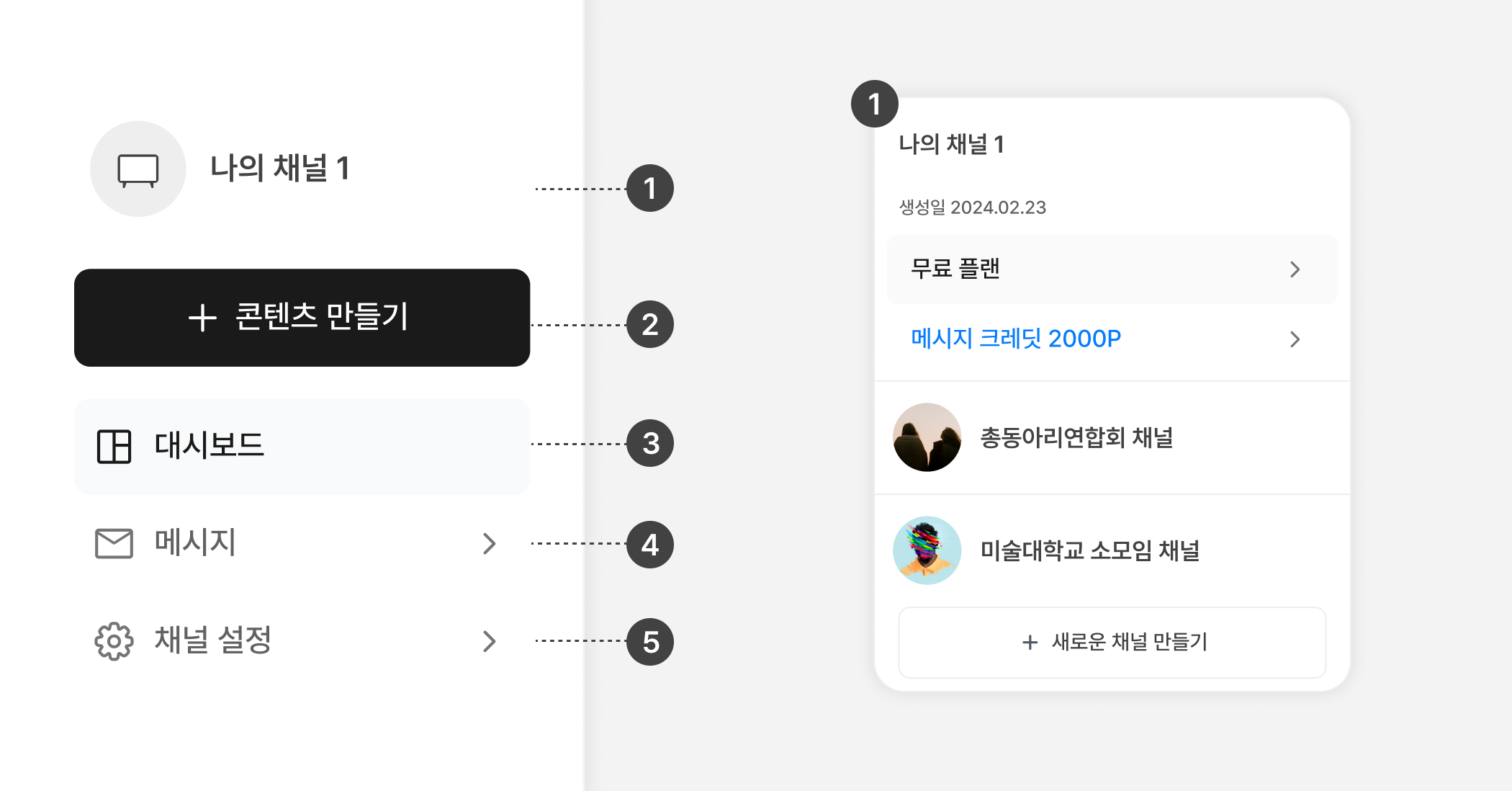 [대시보드]는 채널에 콘텐츠를 생성하거나, 생성된 콘텐츠를 관리할 수 있는 공간이에요.