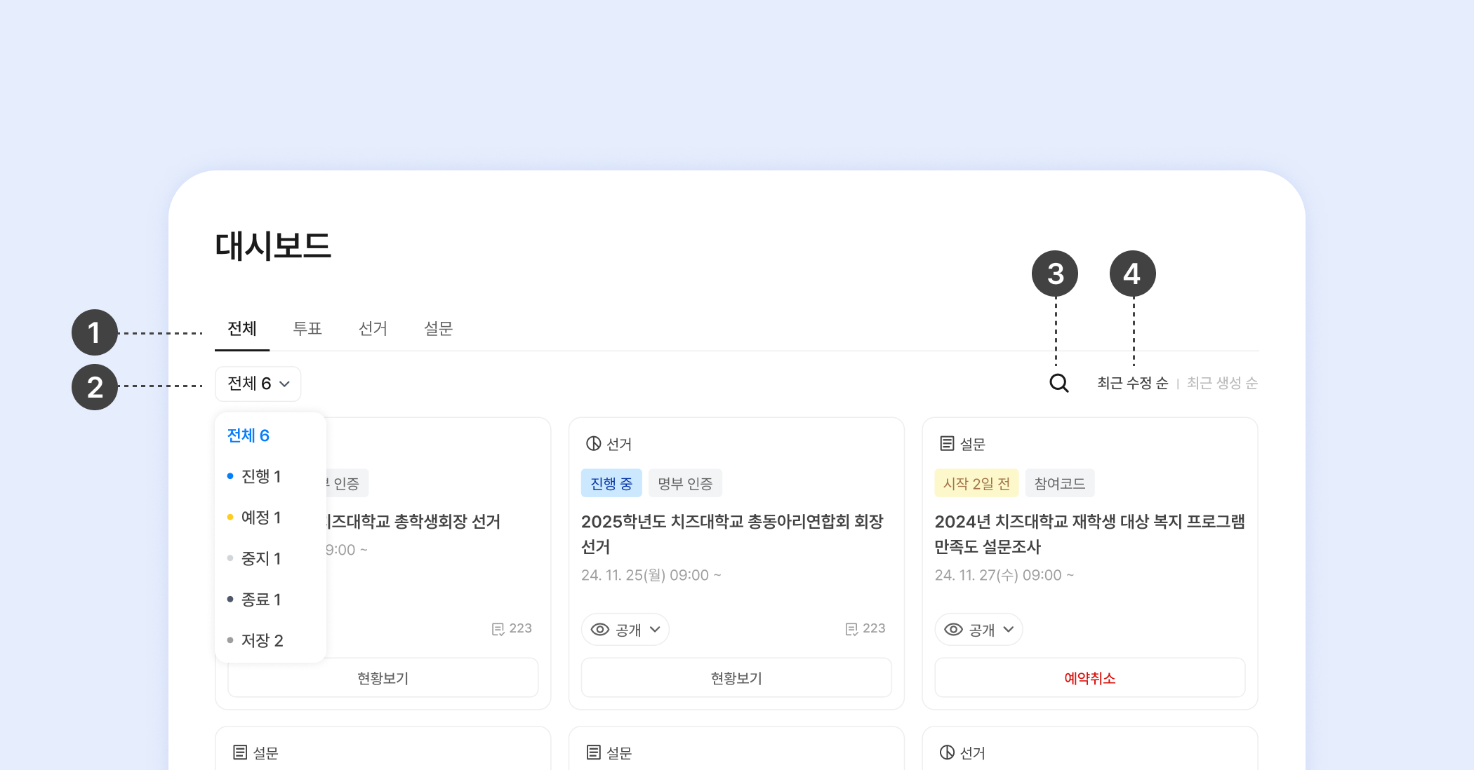 진행상태(진행, 예정, 중지, 종료, 저장)와 참여 설정(모두, 코드인증, 명부인증, 본인인증)을 확인할 수 있어요.