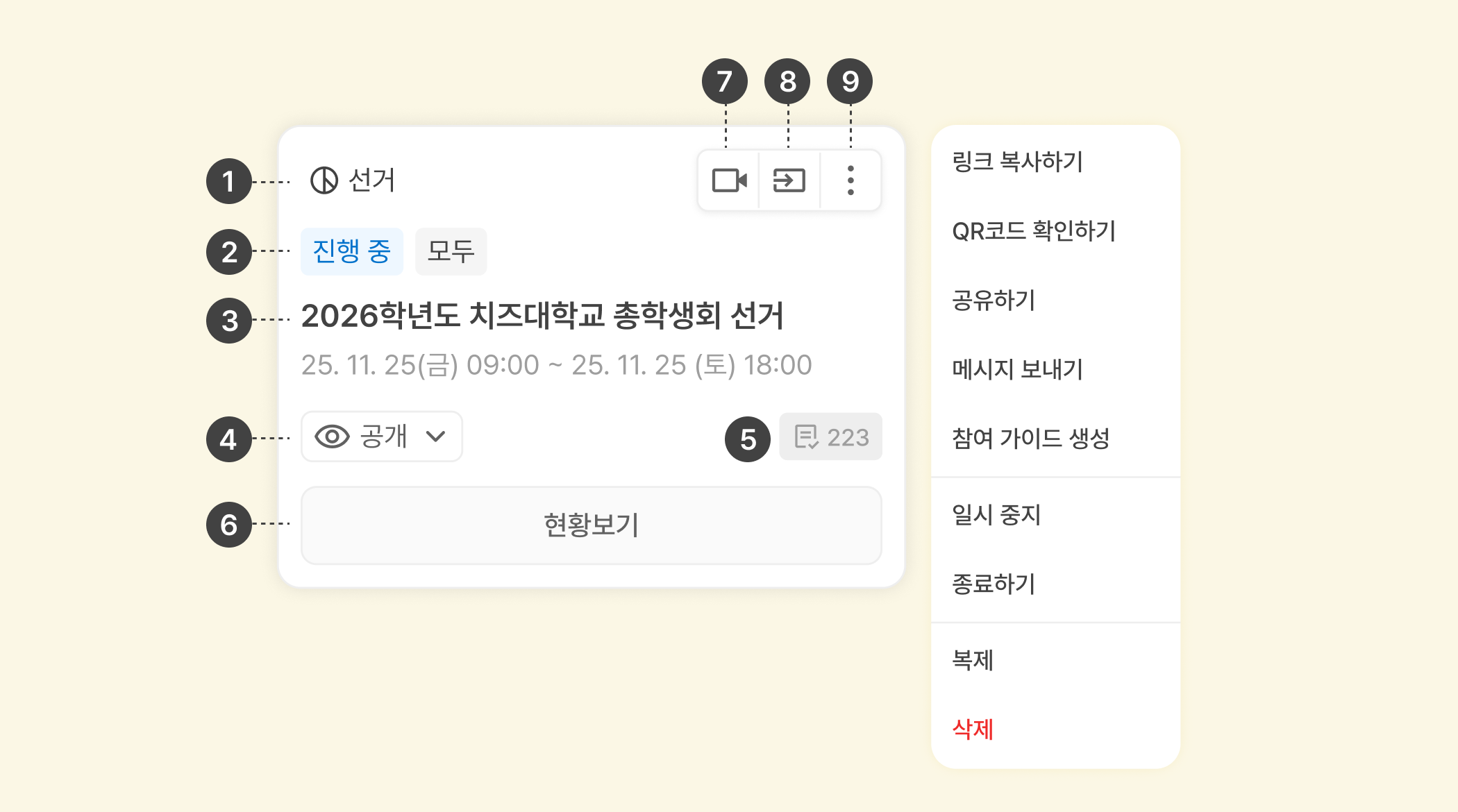 진행 중인 투표나 선거 콘텐츠의 내용과 실시간 결과를 대형 화면으로 공유할 수 있어요.