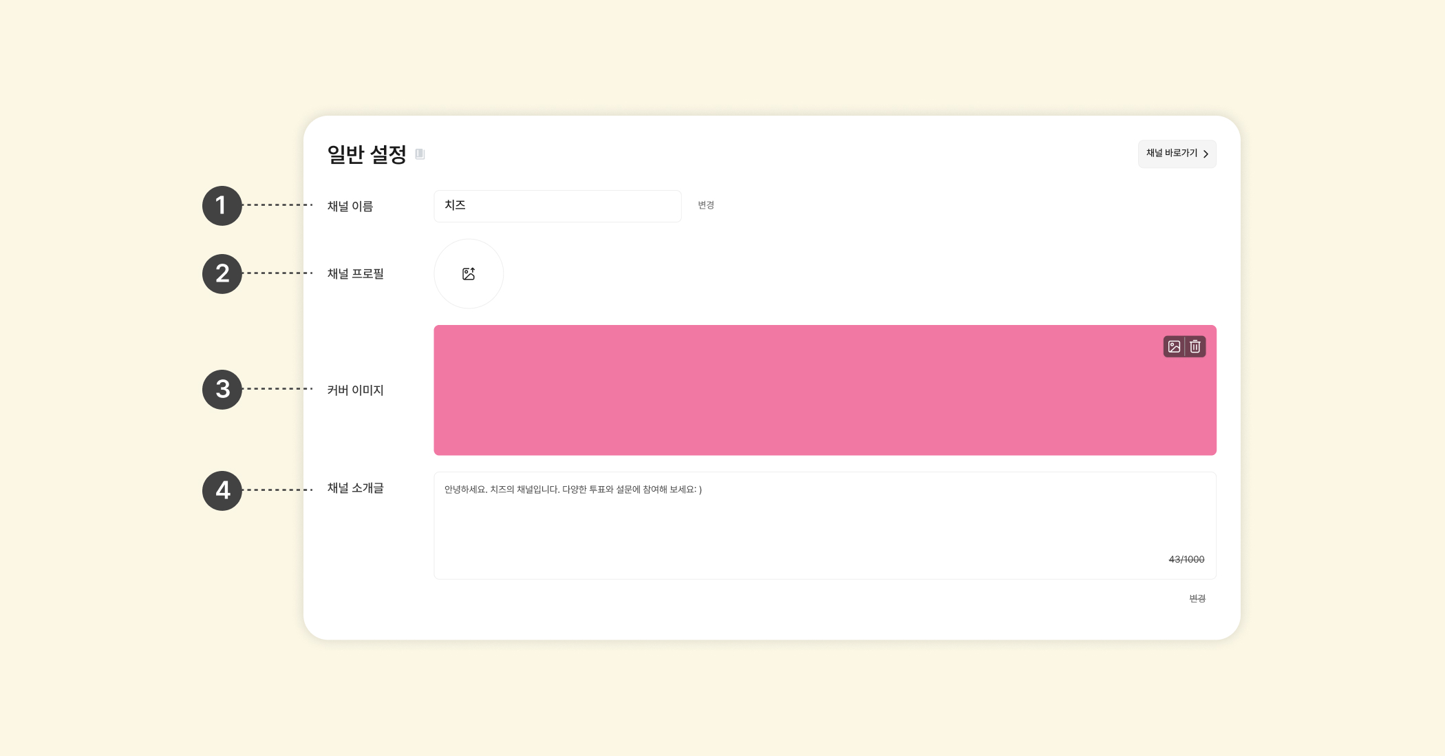 ➌ 커버 이미지 : 채널 상단에 표시되는 커버 이미지를 등록할 수 있어요. 1000x200픽셀 이상의 5:1 비율 이미지를 권장해요.