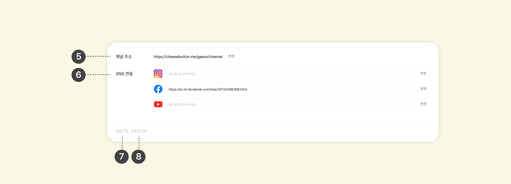 ➏ SNS 연동 : 채널과 관련된 인스타, 페이스북, 유튜브 링크를 연동할 수 있어요.
