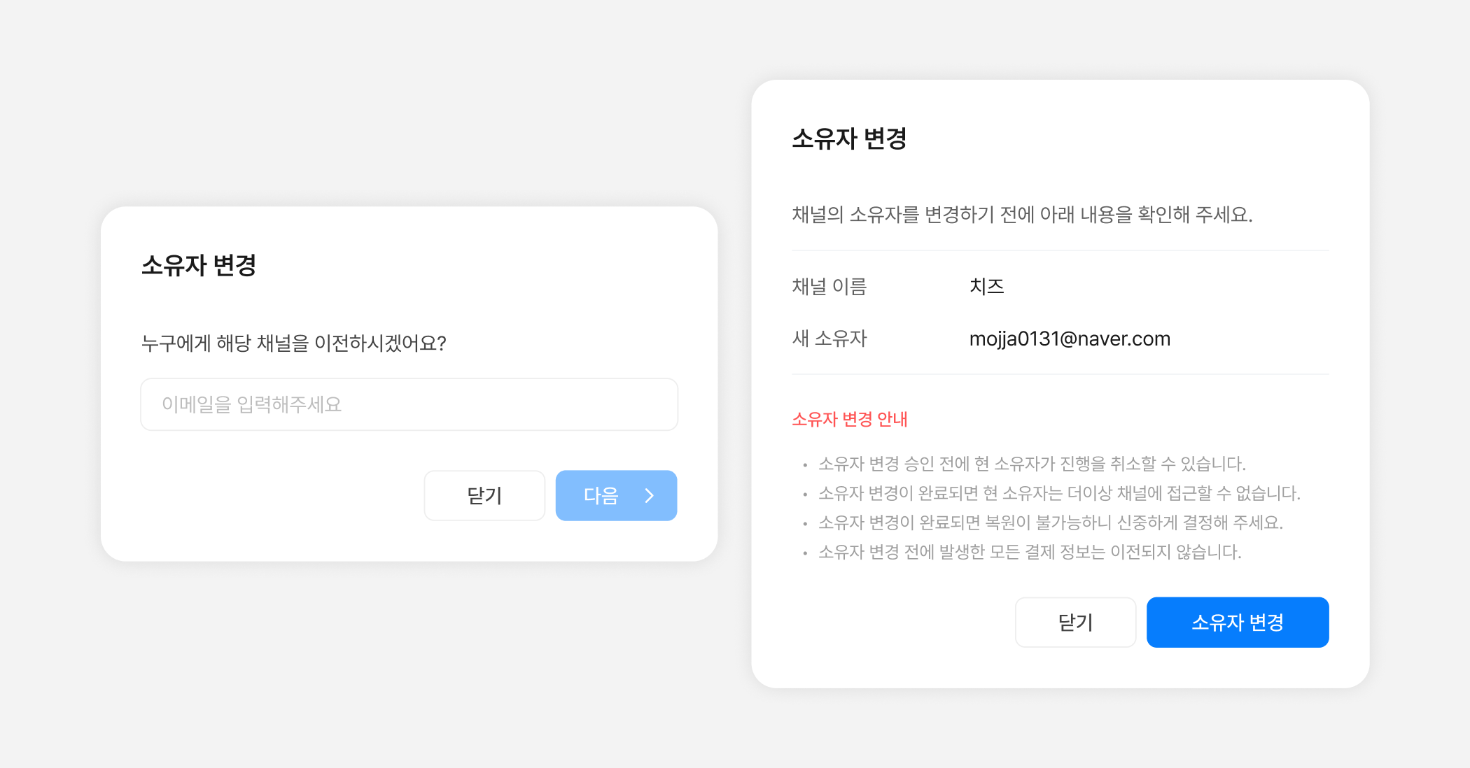 채널 소유권은 [기존 채널 매니저] 혹은 [새 유저]에게 이전할 수 있어요. 새 유저를 초대하는 경우 채널을 이전 받을 사람의 이메일을 직접 작성해 주세요. 새 소유자를 지정하고 소유자 변경 버튼을 클릭하면 소유권 이전이 완료돼요. 소유권을 이전하기 전 아래 유의사항을 확인하세요.