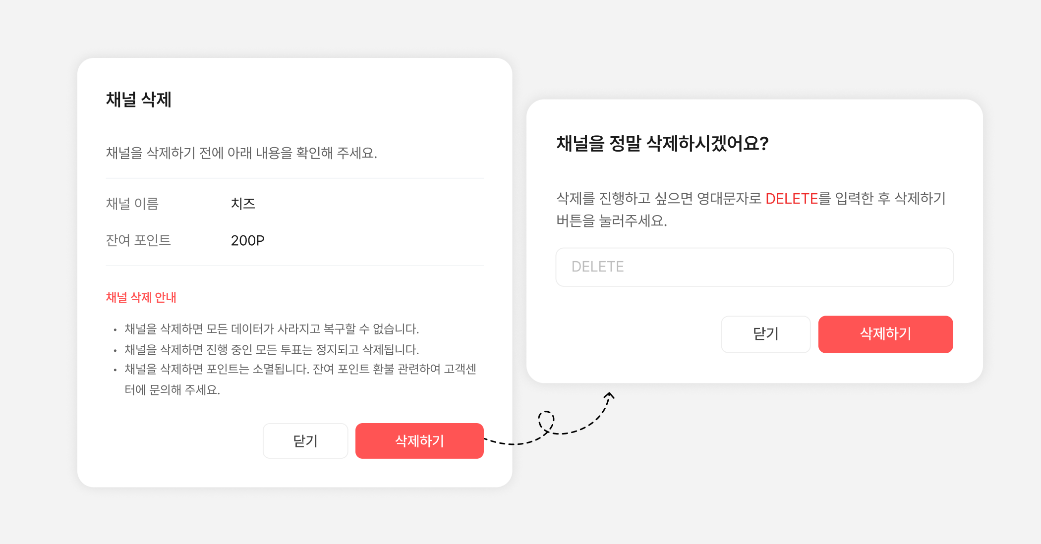 채널에 결제된 포인트는 모두 소멸돼요. 포인트를 환불하고 싶다면 삭제 전 고객센터에 문의해주세요.