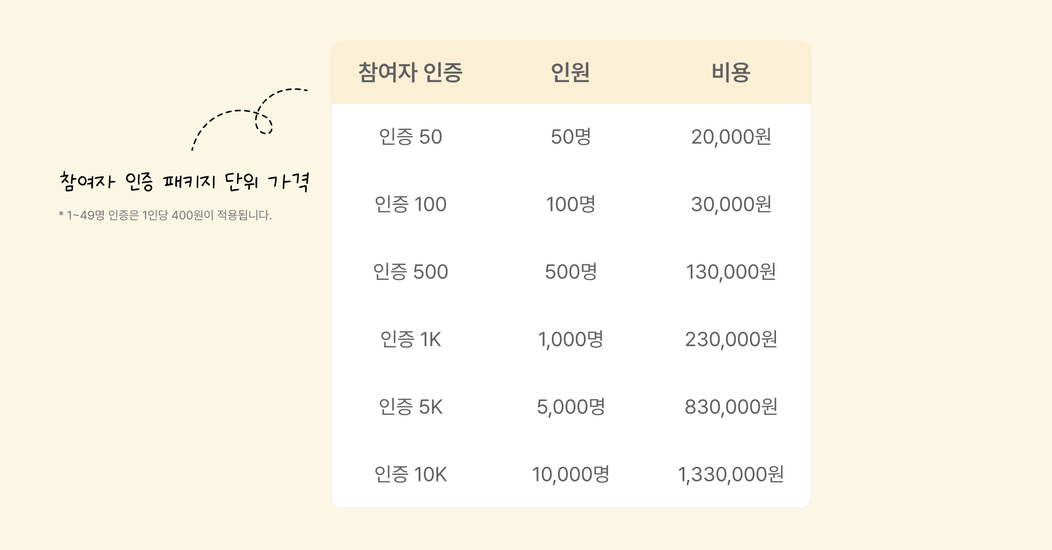 참여자 인증 서비스는 필요한 인원수만큼 가장 효율적인 비용으로 구매하실 수 있도록 패키지 조합 방식으로 가격을 계산해요!