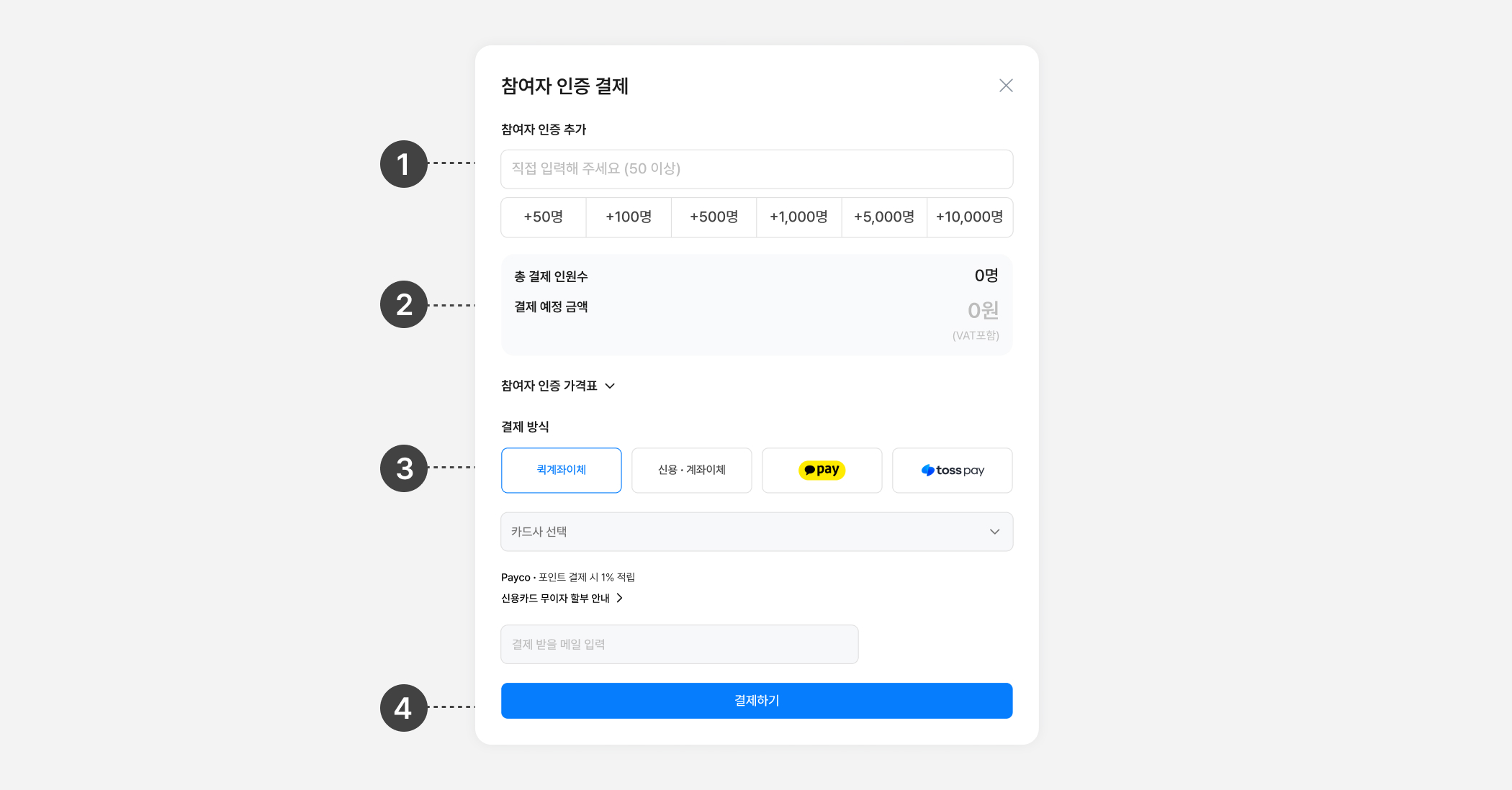 참여자 인증 패키지는 최소 50명부터 구매 가능합니다.