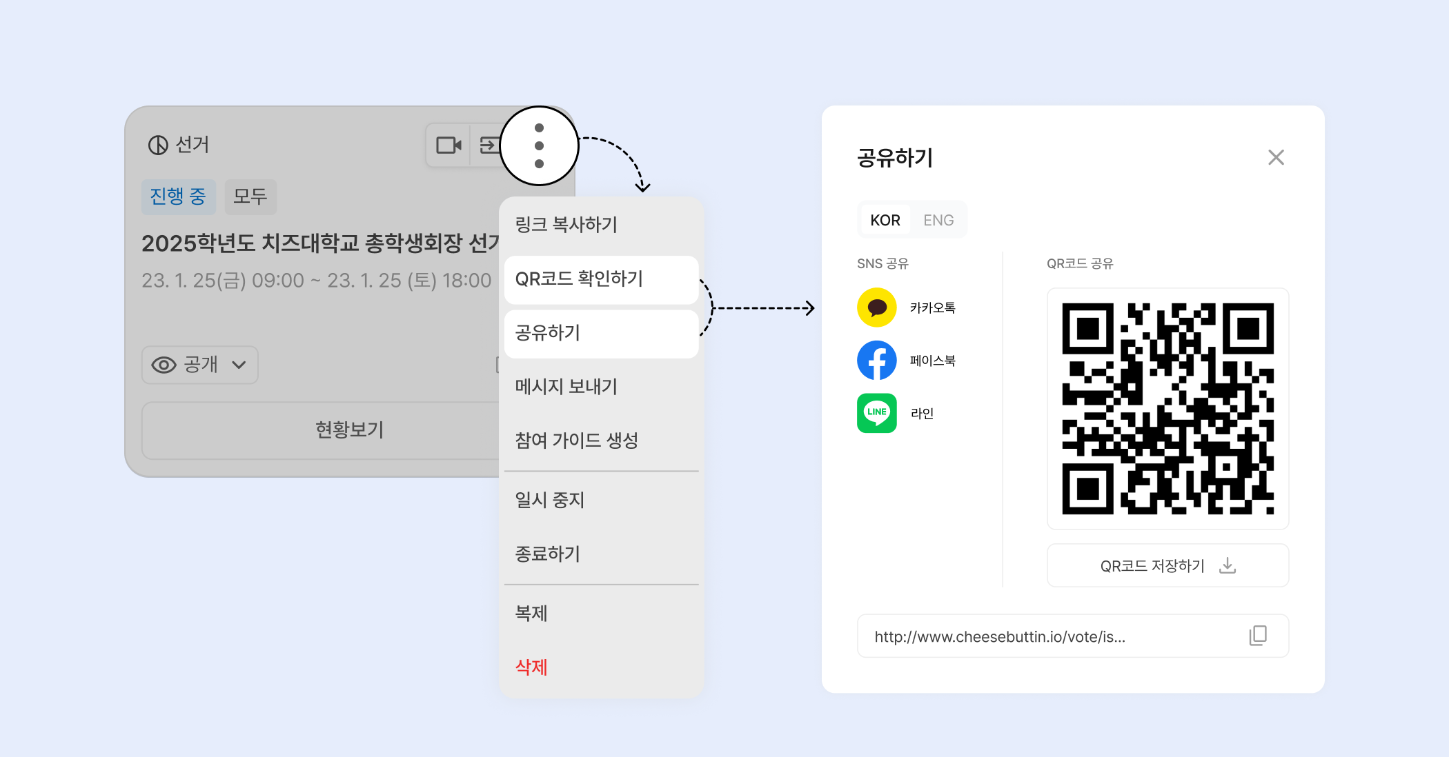 치즈버튼은 링크를 직접 복사하기, 카카오, 페이스북과 같은 SNS로 공유하기, QR 코드 저장 등 다양한 공유 기능을 제공하고 있어요.