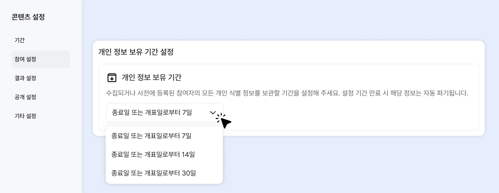 기명 응답이나 본인인증·명부인증 콘텐츠처럼 개인정보를 수집하는 경우, 수집된 정보를 언제까지 보관하고 파기할지 결정하는 것은 매우 중요해요. 제작자가 직접 개인정보 보유 기간을 설정하고, 기간이 지나면 자동으로 안전하게 파기되는 기능을 이용할 수 있어요.