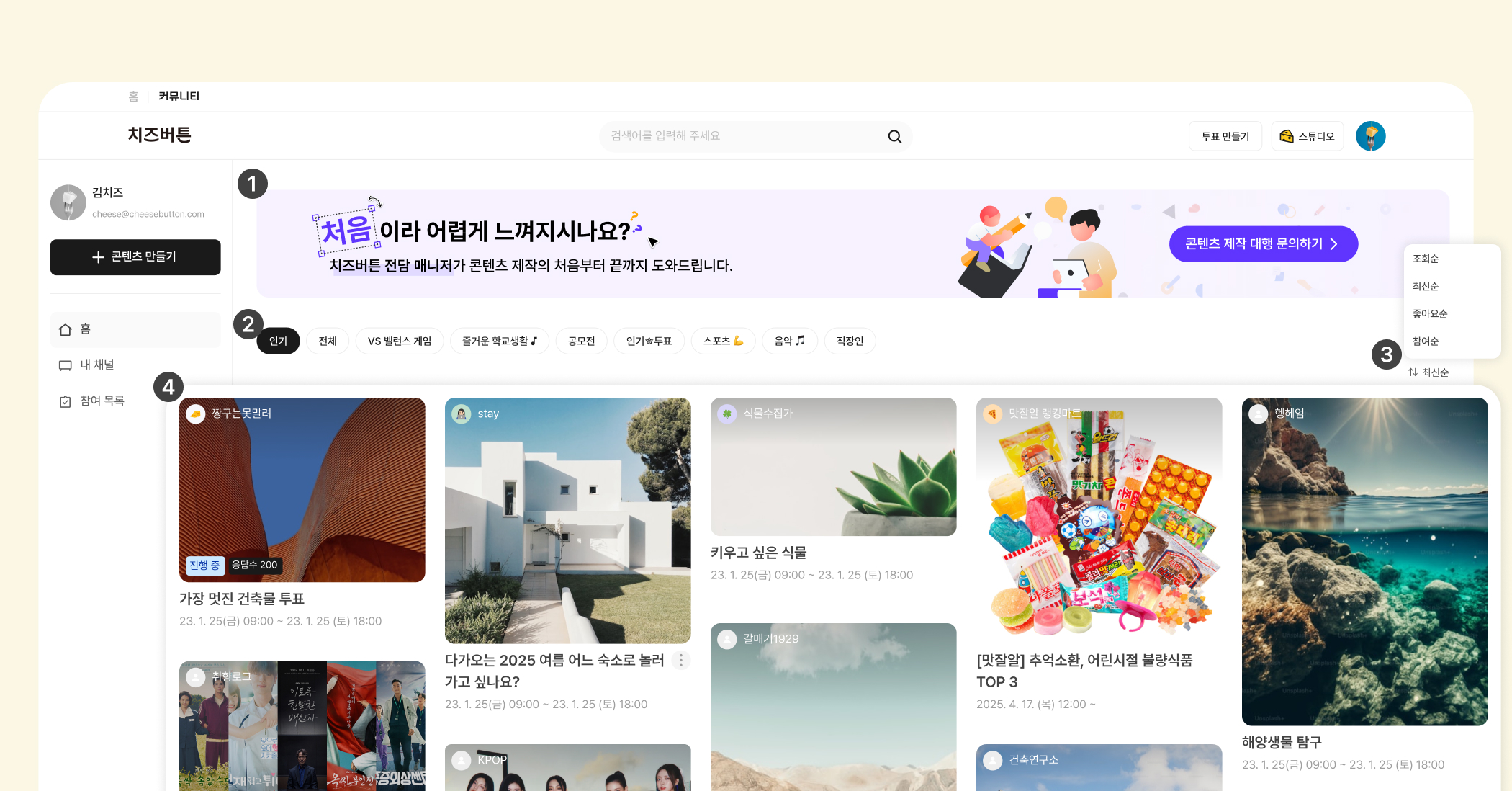 콘텐츠 만들기 버튼을 눌러서 빠르게 스튜디오로 이동 할 수 있어요. 선거, 투표, 설문 등 원하는 유형의 콘텐츠를 손쉽게 생성해 보세요.
