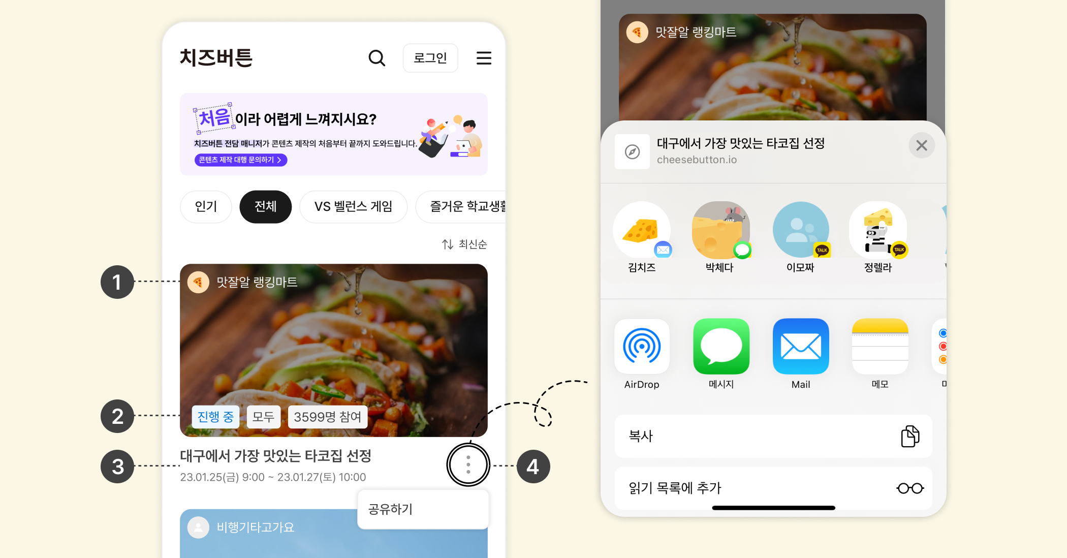 치즈버튼의 특별한 이벤트나 중요한 공지사항을 확인할 수 있어요. 뿐만 아니라 불특정 다수의 참여를 유도하고 싶을 때 여러분의 콘텐츠를 홍보하는 광고판으로도 활용할 수 있답니다. 배너 등록이 필요하시다면 언제든 편하게 문의해 주세요!