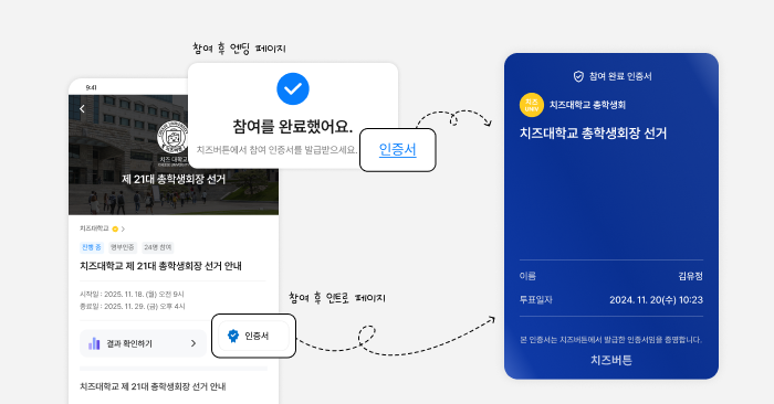 로그인 후 콘텐츠에 참여하면 참여 인증서를 발급 받을 수 있어요. 콘텐츠 메인 페이지나 참여 완료 화면에서 인증서 아이콘을 클릭해 인증서를 다운로드 받아보세요.