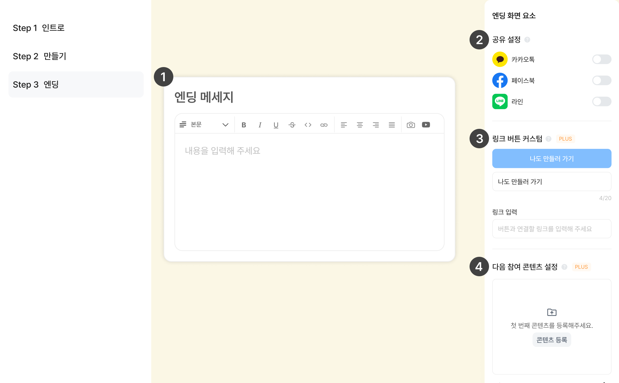 [Step 3 엔딩] 단계에서는 콘텐츠 참여자들에게 노출되는 마지막 페이지를 커스텀 할 수 있어요. Step 3는 프로 플랜 구독자분들께만 제공되는 기능이에요.
